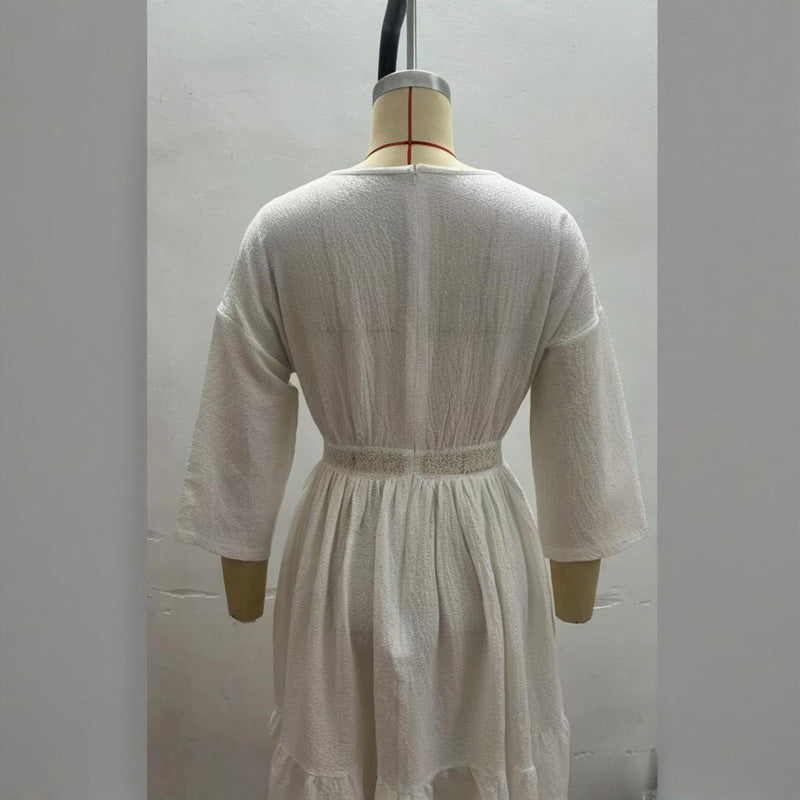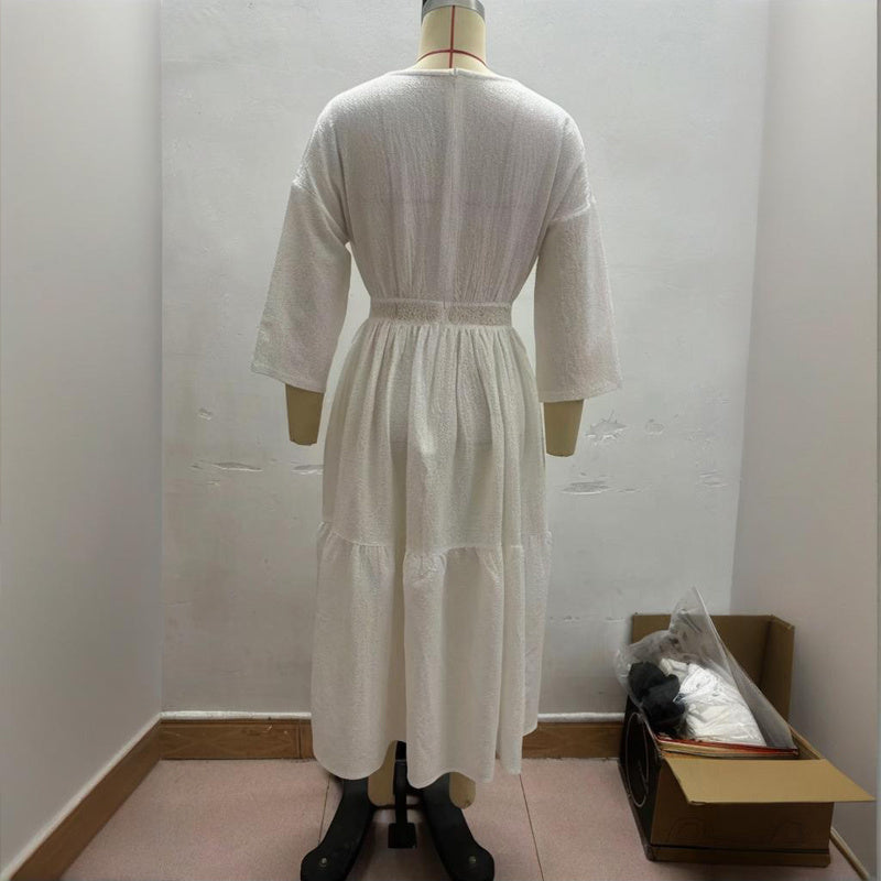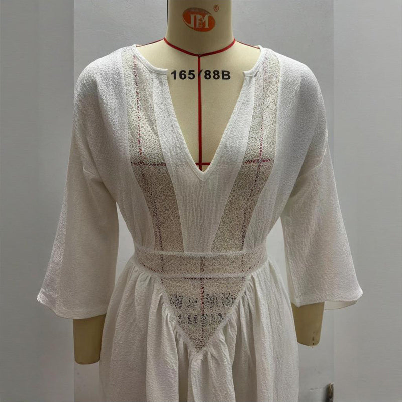 Women's Solid Color Deep V-Neck Long Sleeve Translucent Stitching Design Maxi Beach Bohemian Style Dress